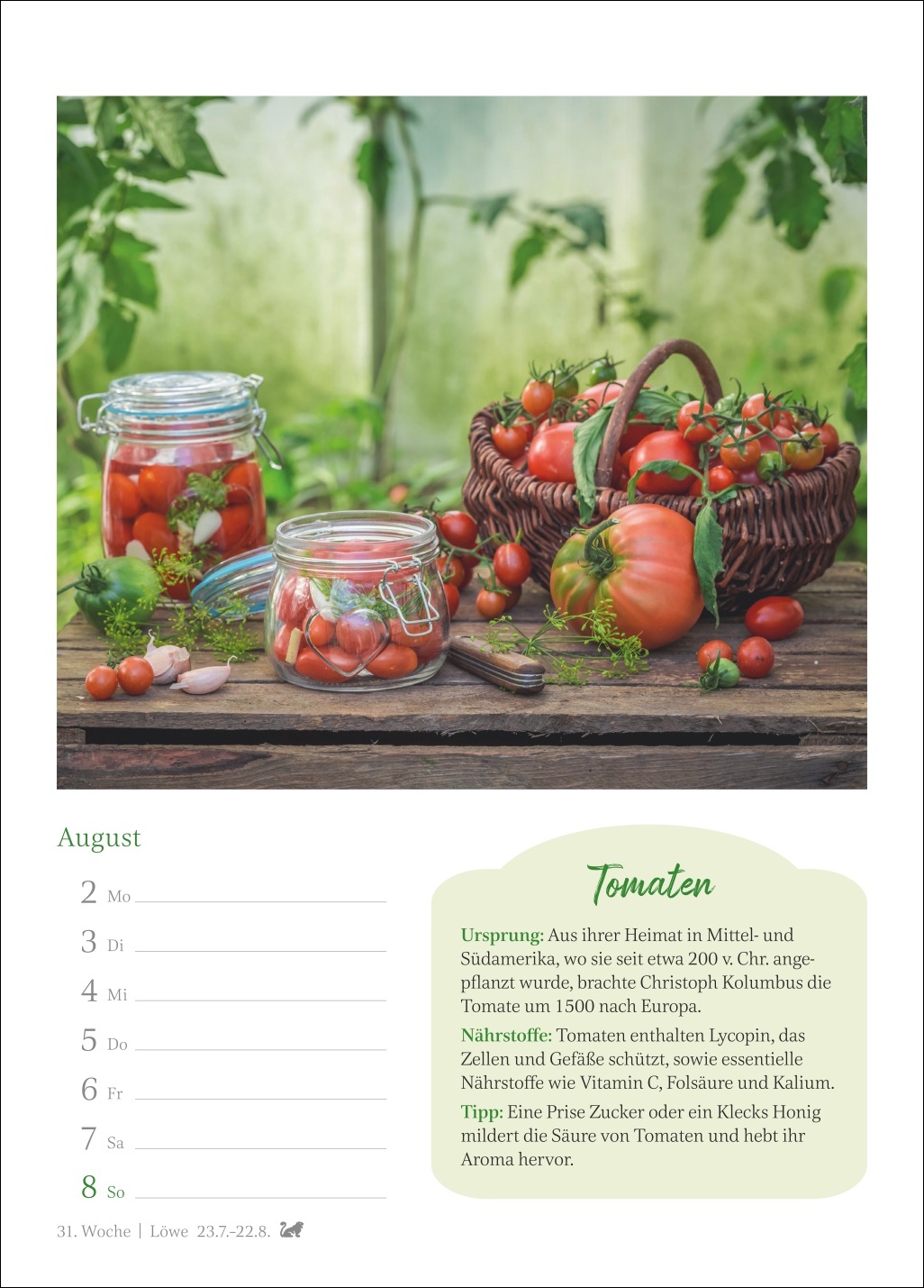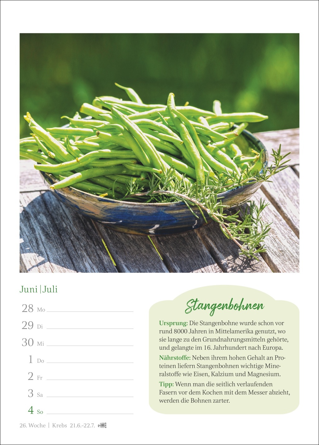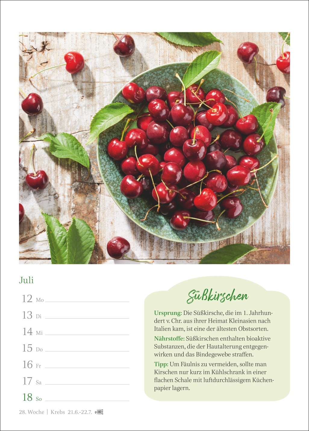 - Ein Genuss für jede Wand: Kalender, der auf jedem Blatt eine dekorative Fotografie mit wertvollem Küchenwissen verbindet und zugleich einen Überblick über alle Termine der Woche bietet