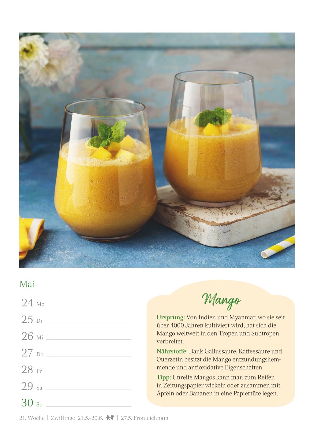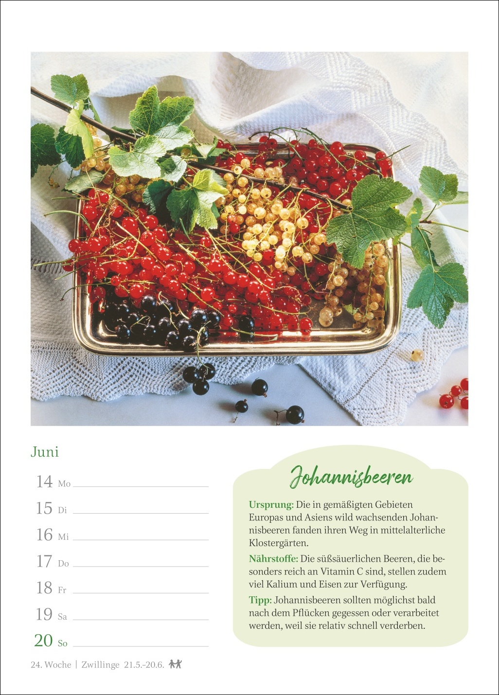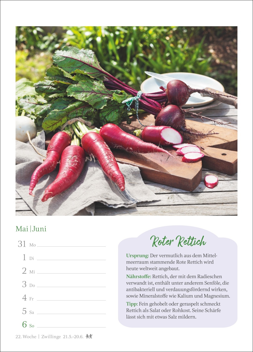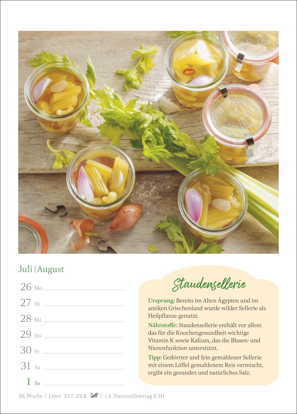 - Ein Genuss für jede Wand: Kalender, der auf jedem Blatt eine dekorative Fotografie mit wertvollem Küchenwissen verbindet und zugleich einen Überblick über alle Termine der Woche bietet