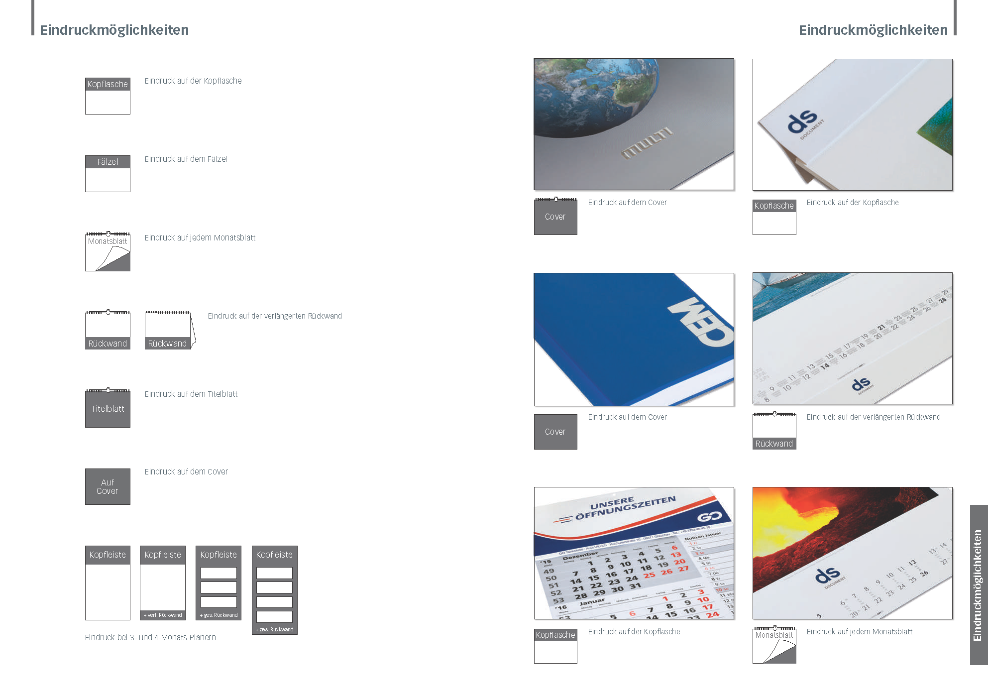 Eine individuelle Werbeanbringung ist bereits ab 50 Stück möglich. Die jeweiligen Optionen zeigen wir ganz individuell bei jedem Kalendertitel an – im Katalog und auf der Homepage mithilfe von Piktogrammen oder Textinformationen.