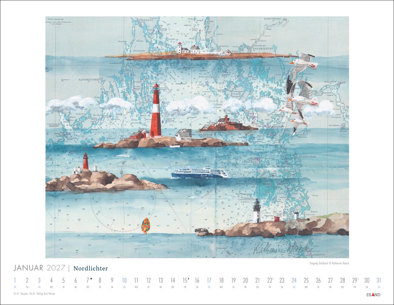 - Detaillierte Malerei vor dem Hintergrund nautischer Navigationshilfen: Kunst und Meer treffen in diesem Bildkalender 2027 auf ganz besondere Weise zusammen