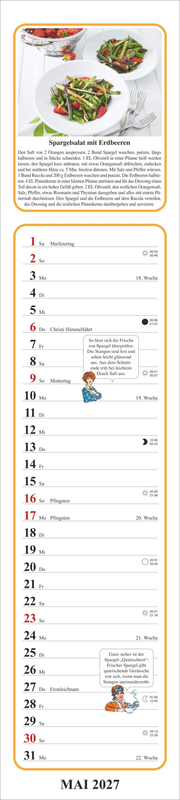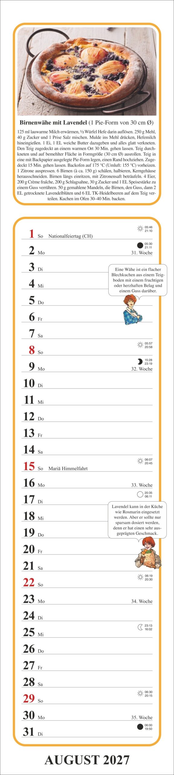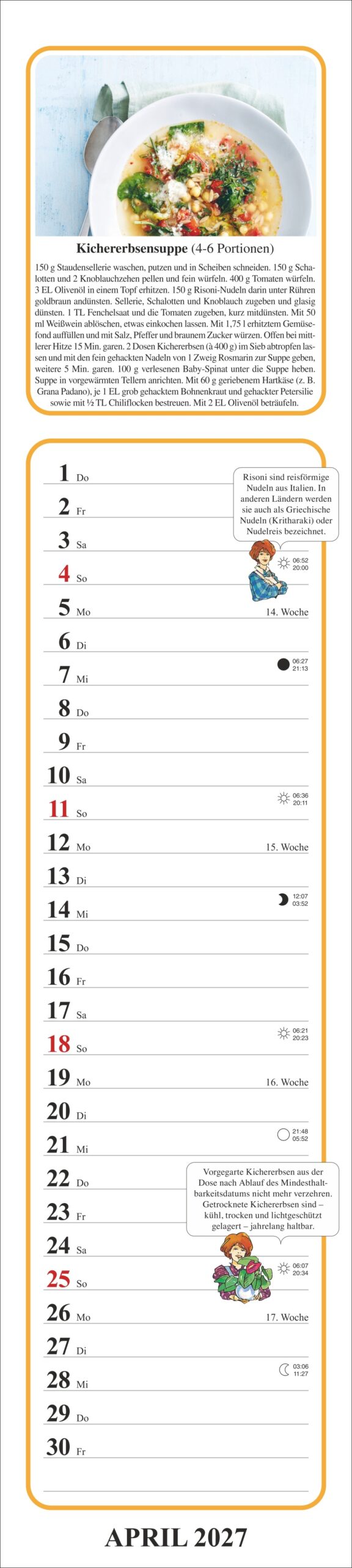 Tante Claras Küchenkalender ist zunächst ein praktischer Küchenkalender voller schmackhafter Rezepte und nützlicher Tipps. Der obere Teil des Kalenders kann ins private Kochbuch geklebt werden.