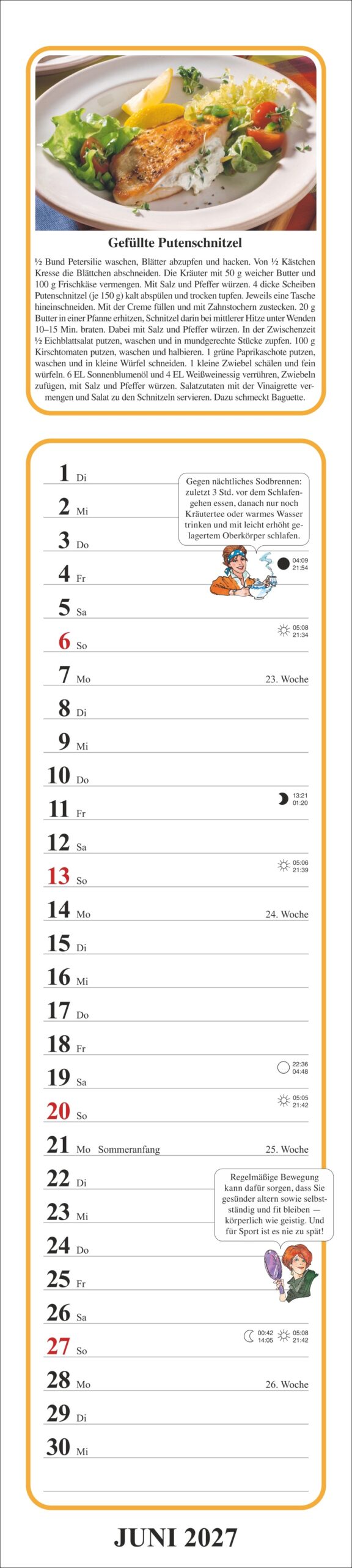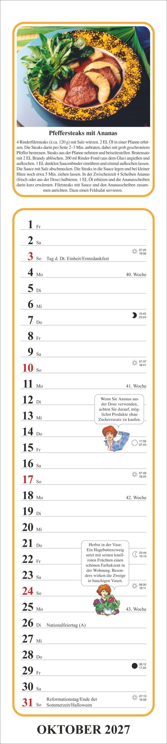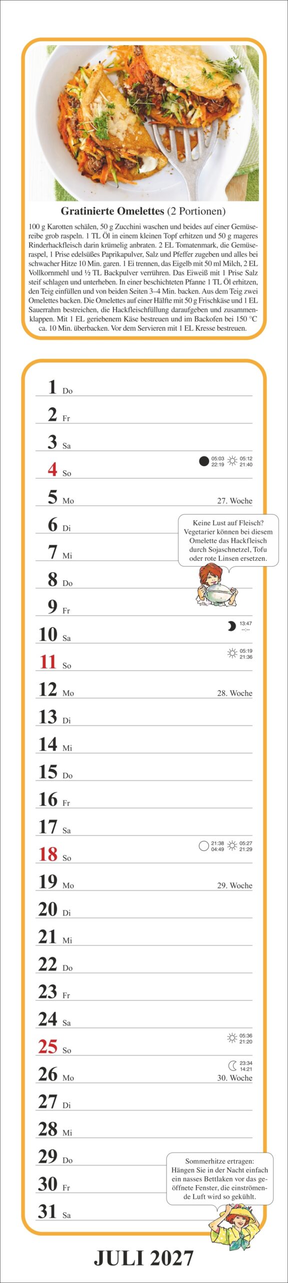 Tante Claras Küchenkalender ist zunächst ein praktischer Küchenkalender voller schmackhafter Rezepte und nützlicher Tipps. Der obere Teil des Kalenders kann ins private Kochbuch geklebt werden.